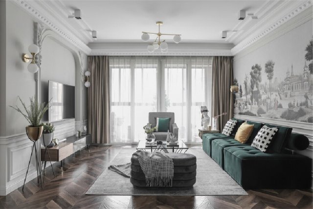 客厅整个空间,色彩表达素雅,以白色和浅灰色为基调,地面选用胡桃木色鱼骨拼地板,饱满沉稳,有很好的居住舒适感。