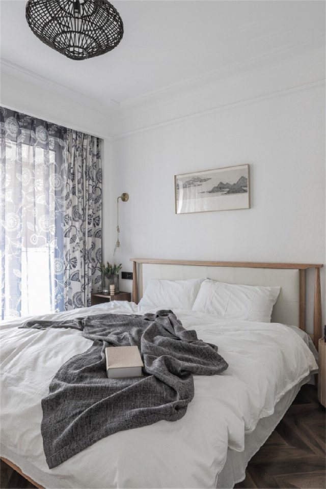 这是爷爷奶奶的房间,用色则是偏向宁静素雅,以白为主,以净为辅,白色皮革与原木色结合的床架,简约素雅的床饰,藏蓝色花纹窗帘,沉稳而端庄,更加适合老人。
