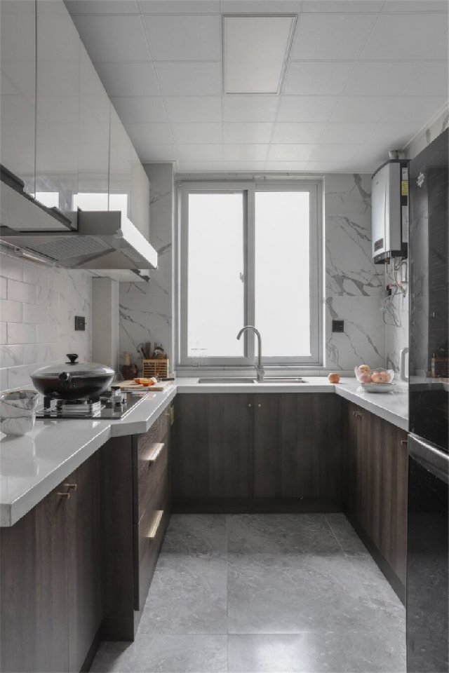 厨房的柜子,做了分色设计,下柜选用深色木纹饰面板,纹理古朴自然,点缀了锤纹金色把手,吊柜选用白色亮面亚克力材质柜门,黑色把手与门框镶嵌一体,更加便于平日的清洁打理。